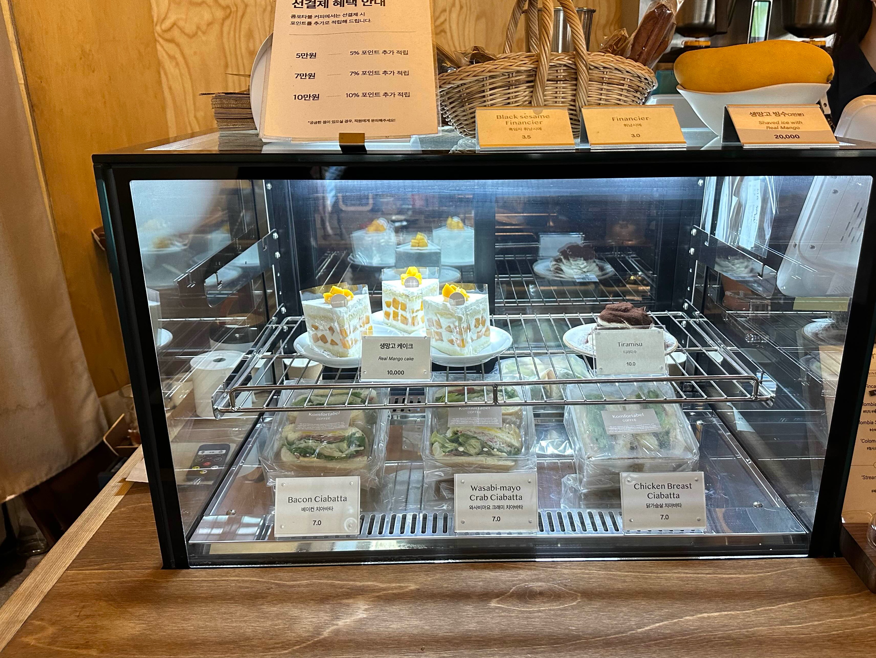 쇼케이스 냉장고 안에 눈에 띄는 망고 케이크가 있습니다.망고케이크 주문시 오늘의 커피 한잔을 같이 주신다고 합니다.