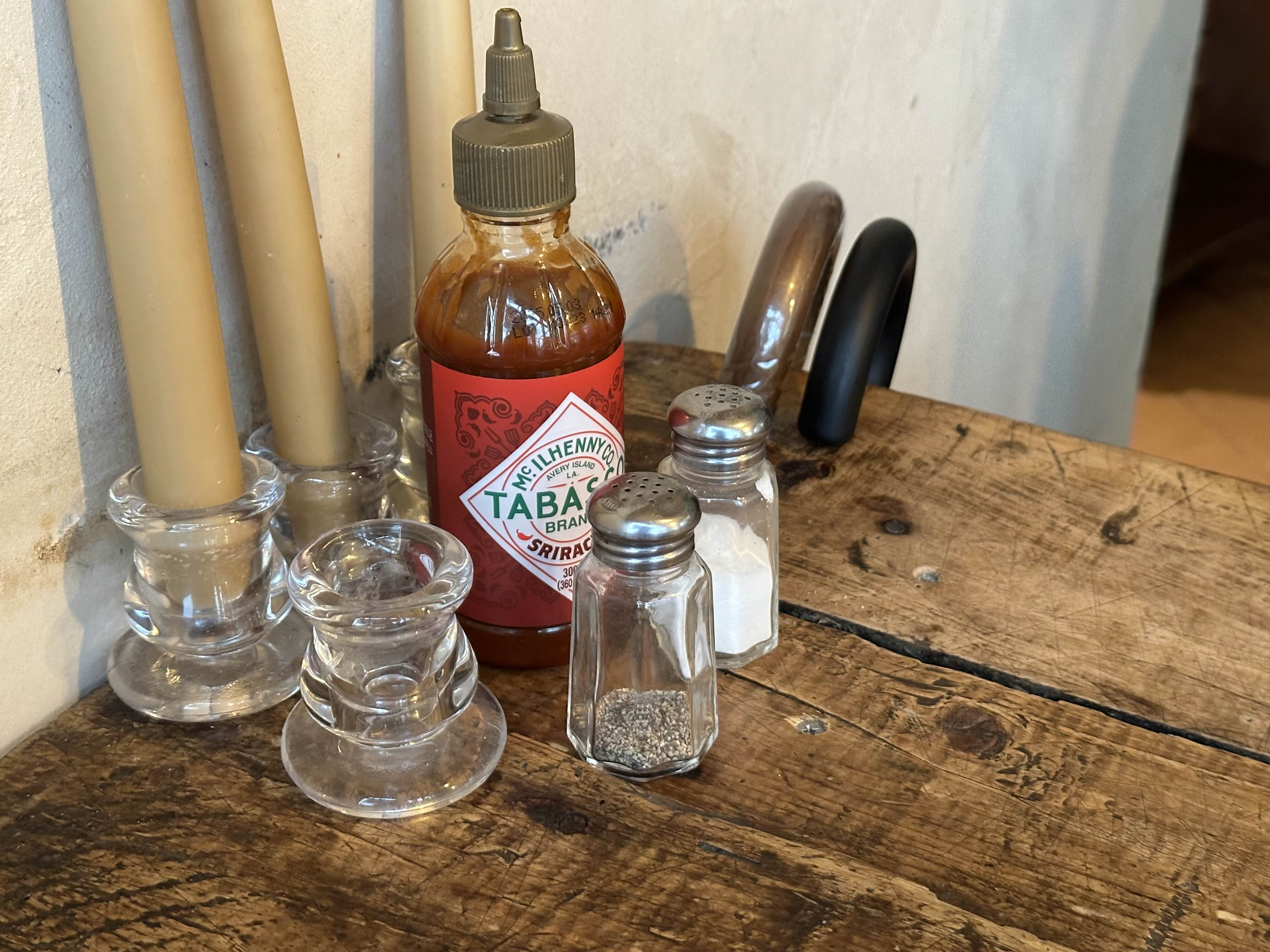 파이에 곁들여 먹을 수 있는 후추, 소금, 타바스코가 있습니다.