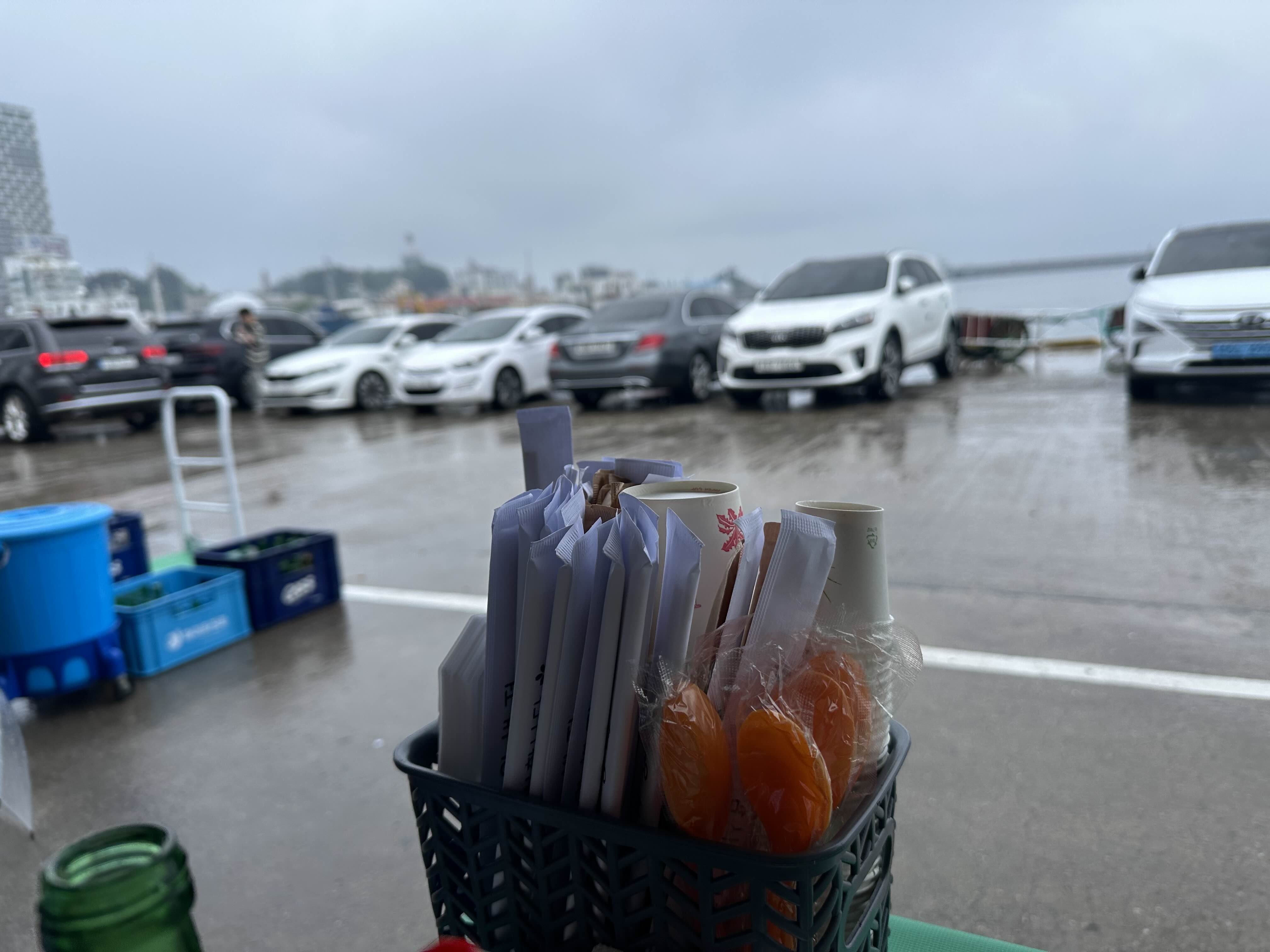 속초항 여객선 터미널 인근 점포 앞뒤로 주차 공간이 있어요.
