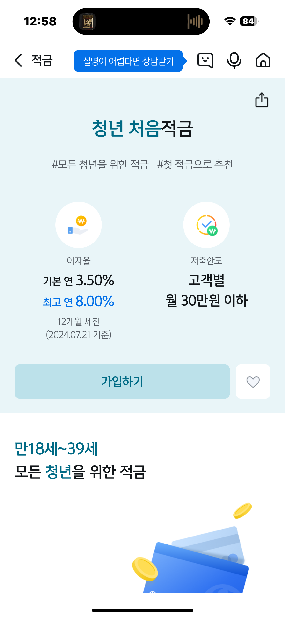 청년 처음 적금은 가입 대상이 정해져 있습니다. 가입일 기준 만 18세이상 만 39세 이하를 대상으로 하고 있어요.