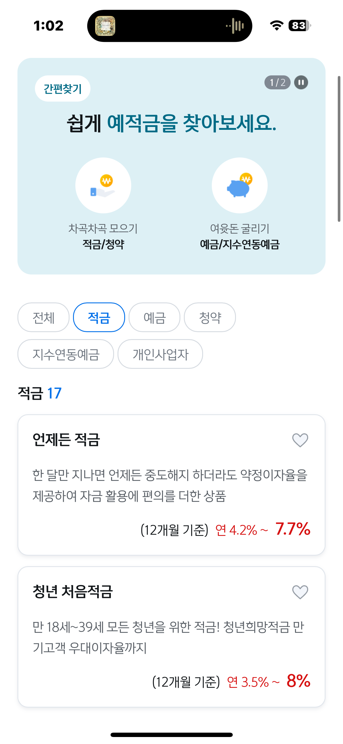 3. 이중 적금을 선택하면 언제든 적금, 청년 처음 적금이 상단에 있습니다.