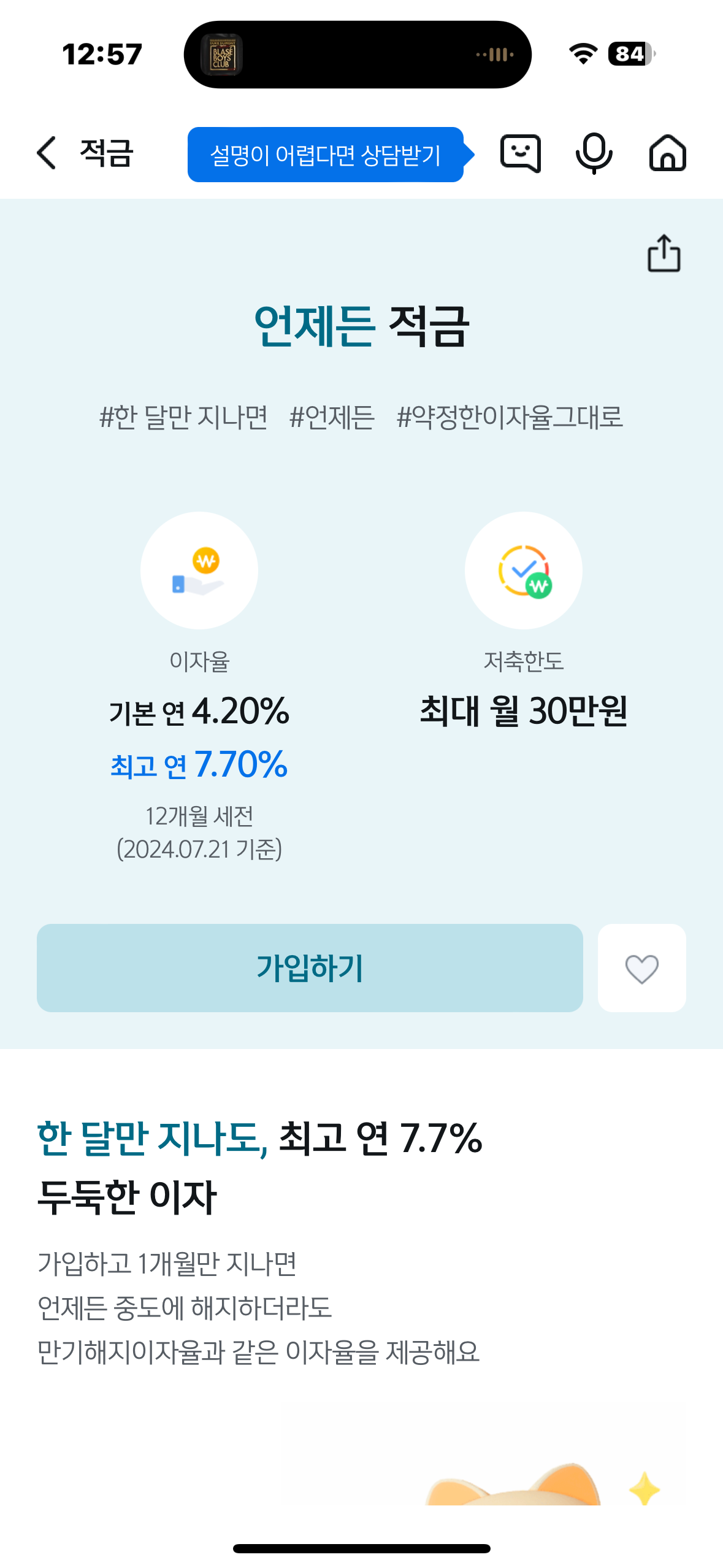 30만원까지 납입 가능한 상품이며 가입기간은 12개월입니다.