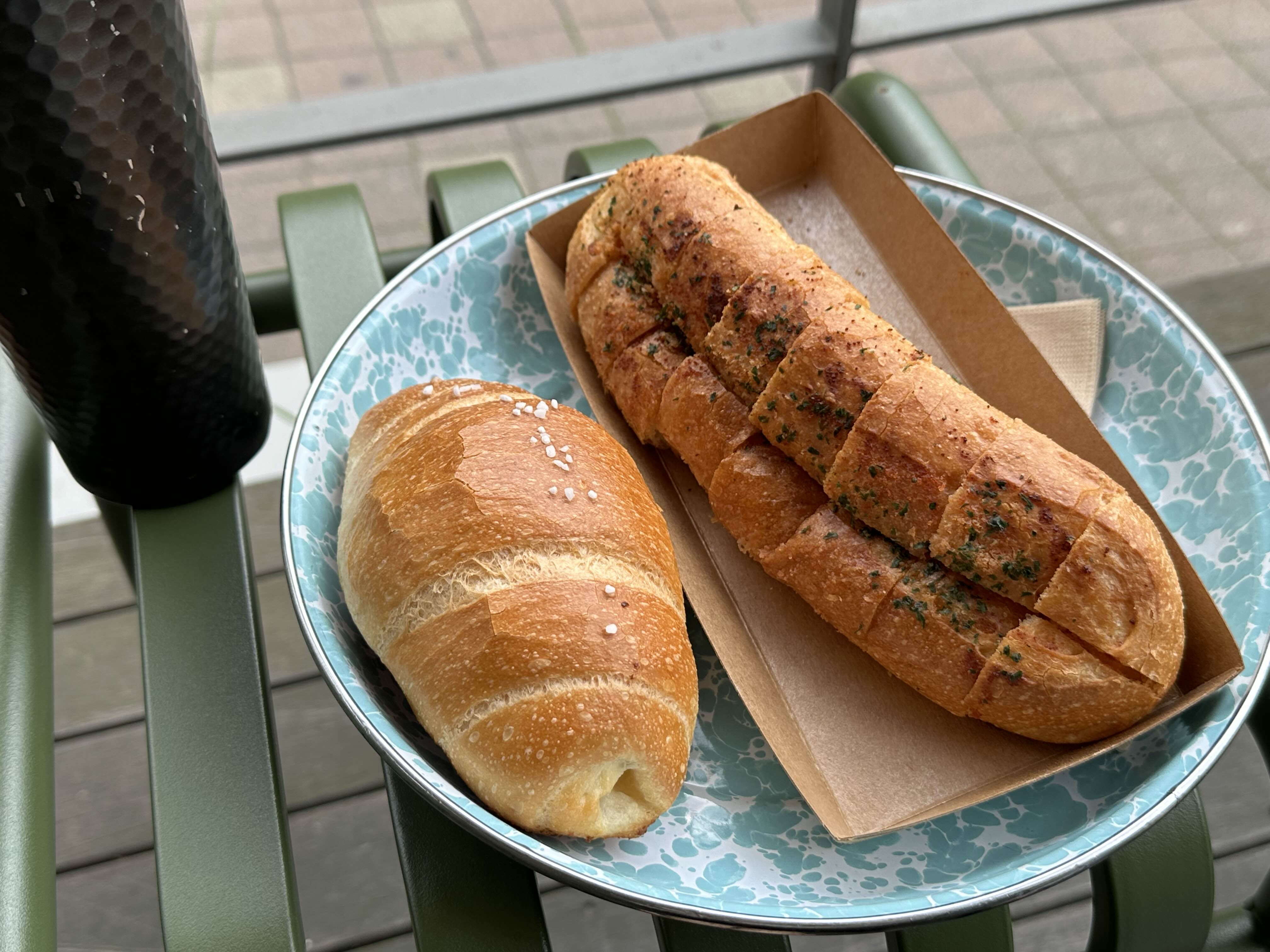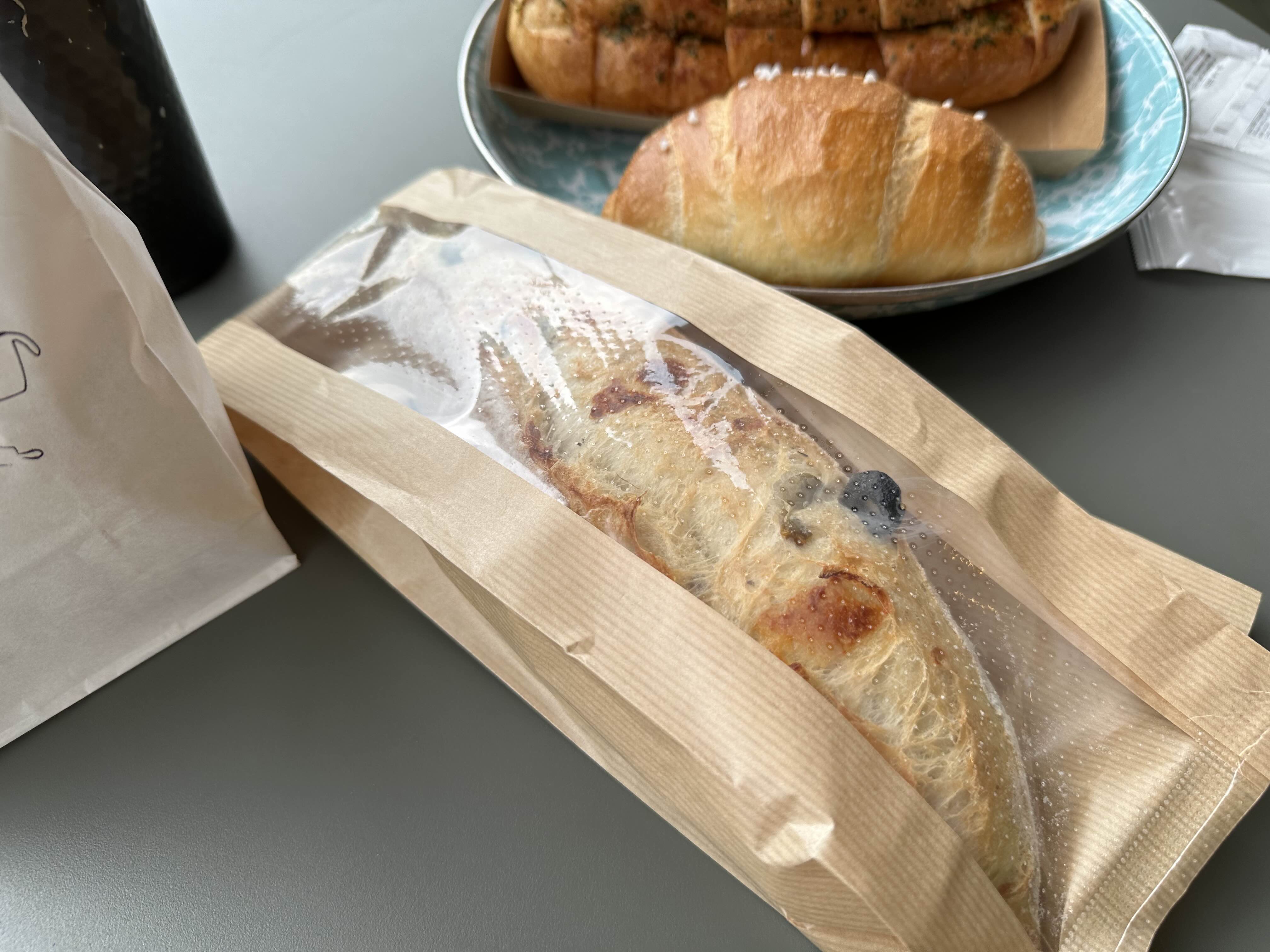 포장으로 소금빵 2개와 올리브치즈바게트를 구매했습니다.