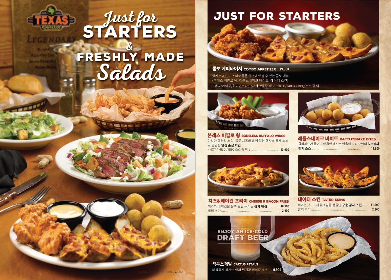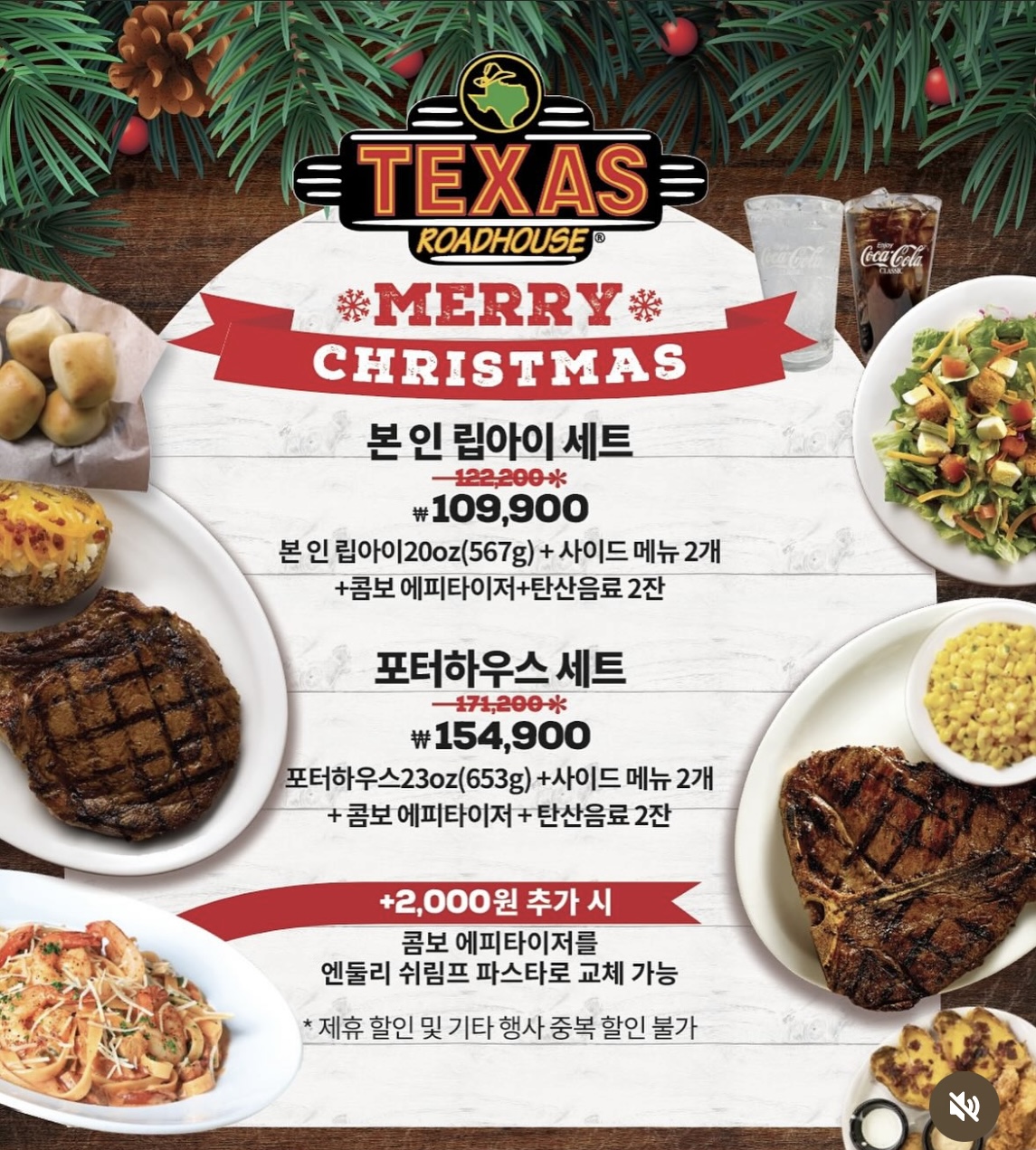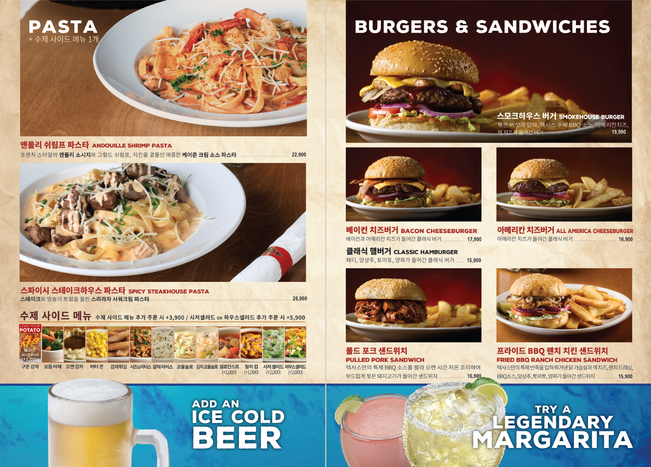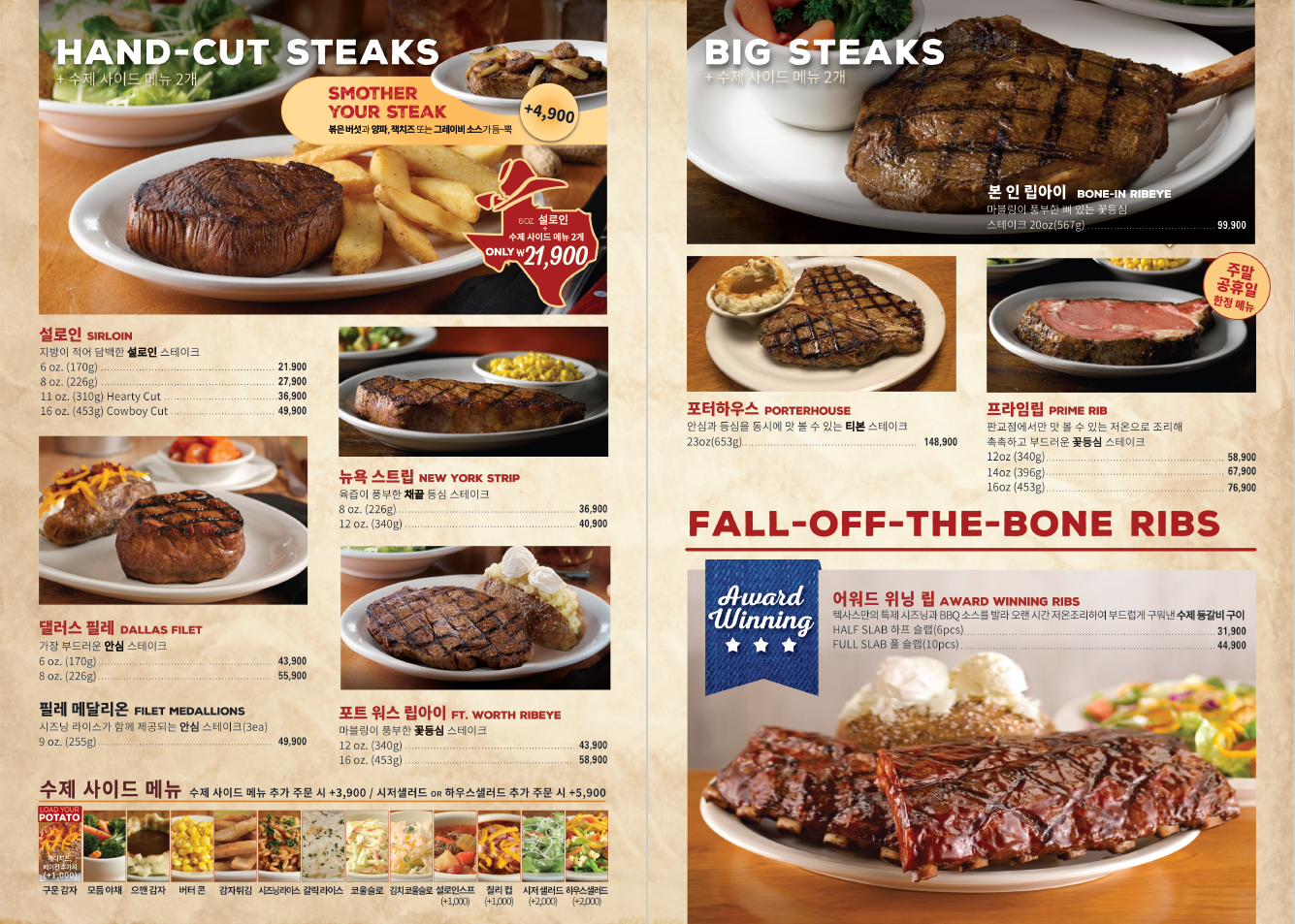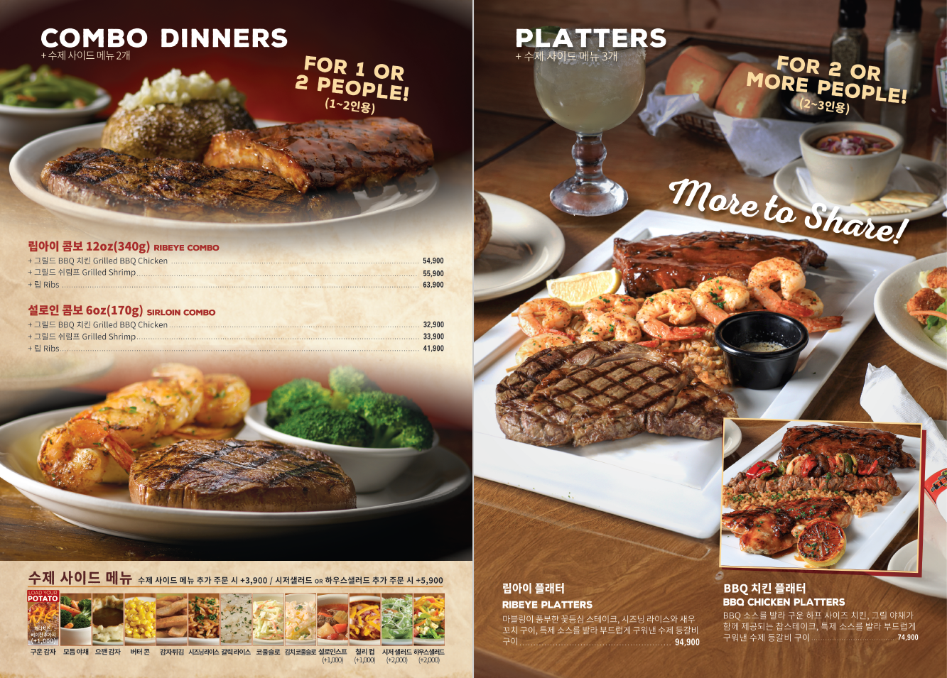 텍사스로드하우스에서는 메인 메뉴당 2개의 사이드메뉴 선택이 가능합니다.