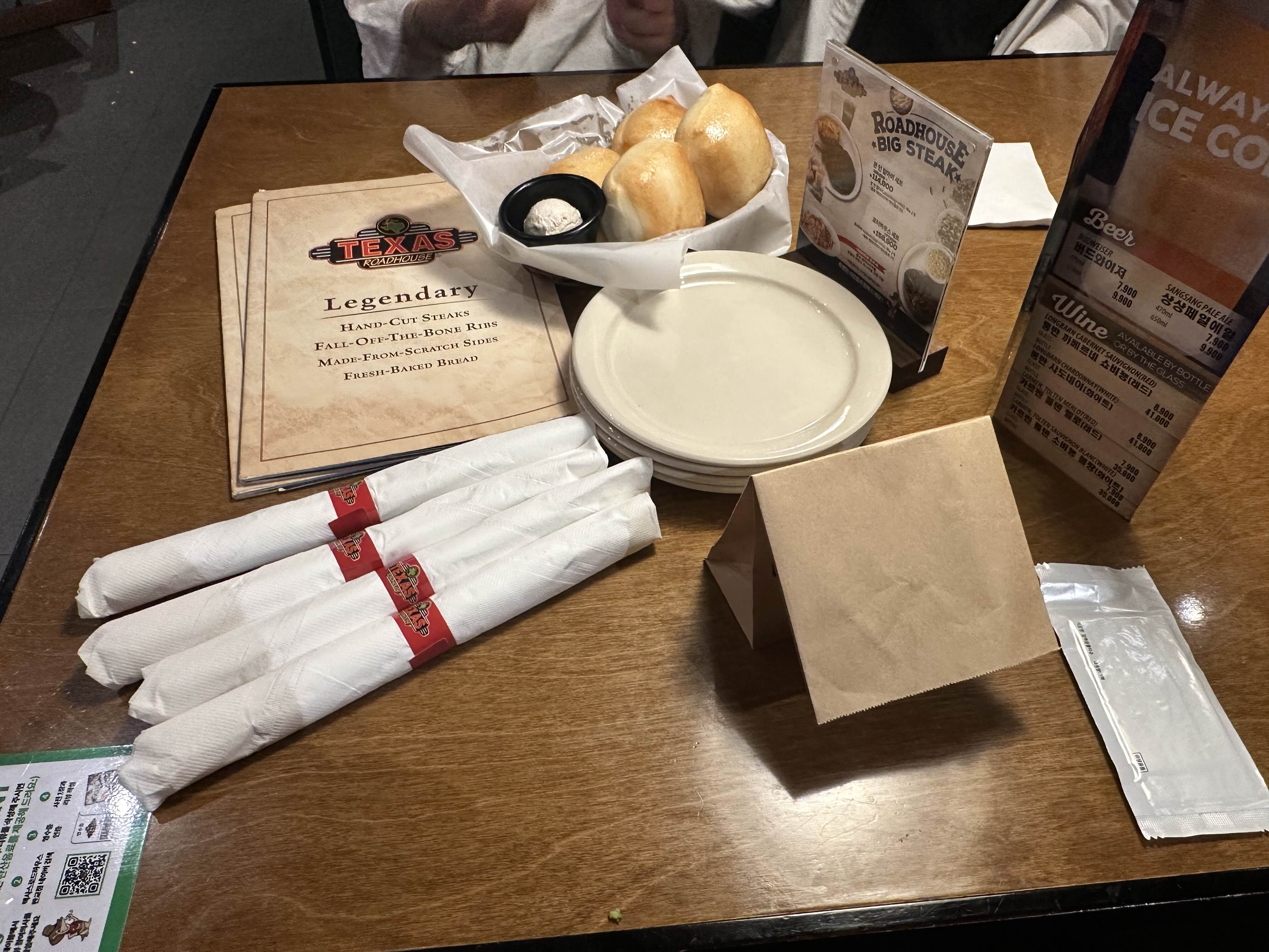 앞접시, 커트러리, 메뉴판, 물티슈 그리고 식전빵이 나왔습니다.