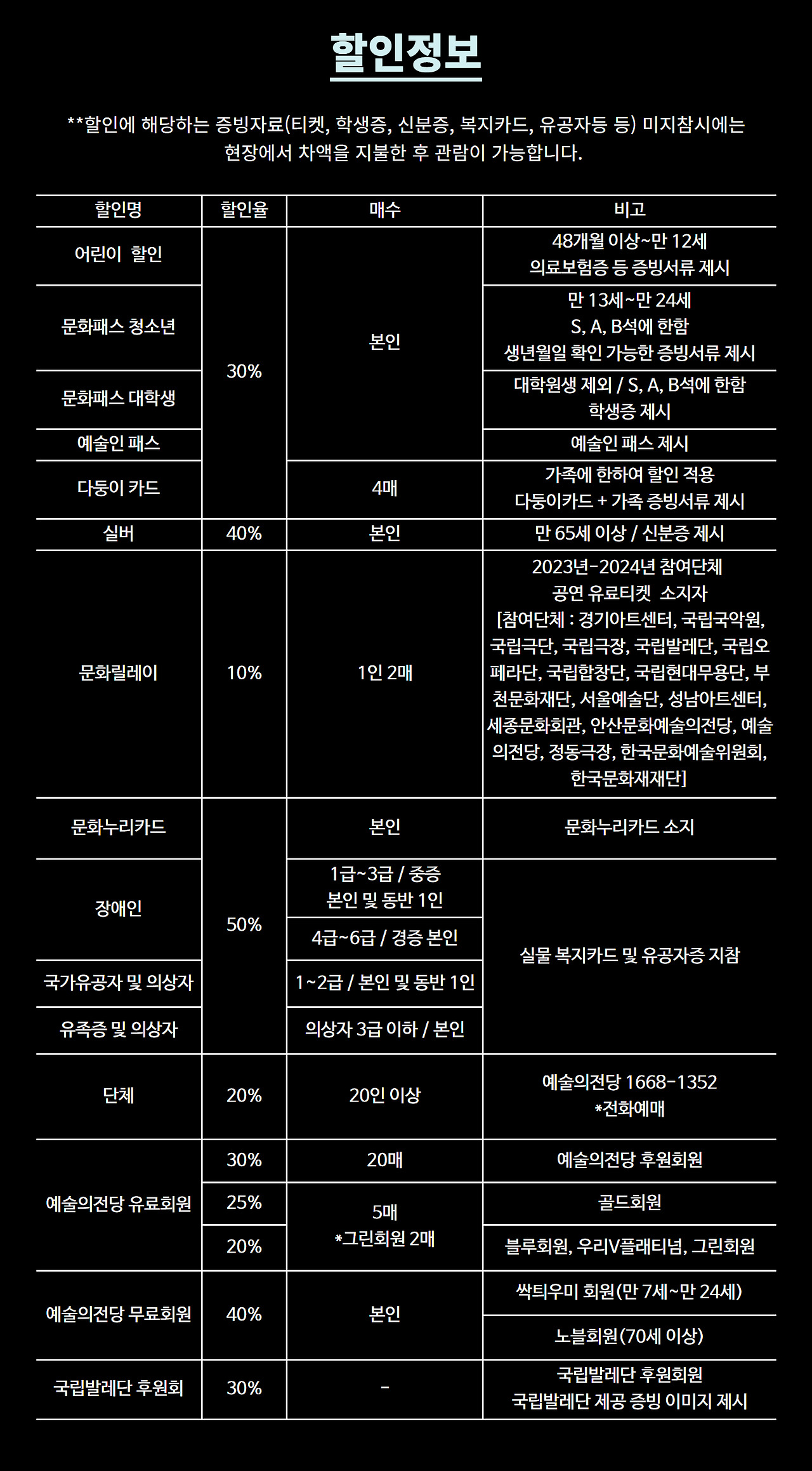 예술의 전당 홈페이지에서 수수료 없이 예매가 가능하니예술의전당 홈페이지에서 예매를 추천드려요.